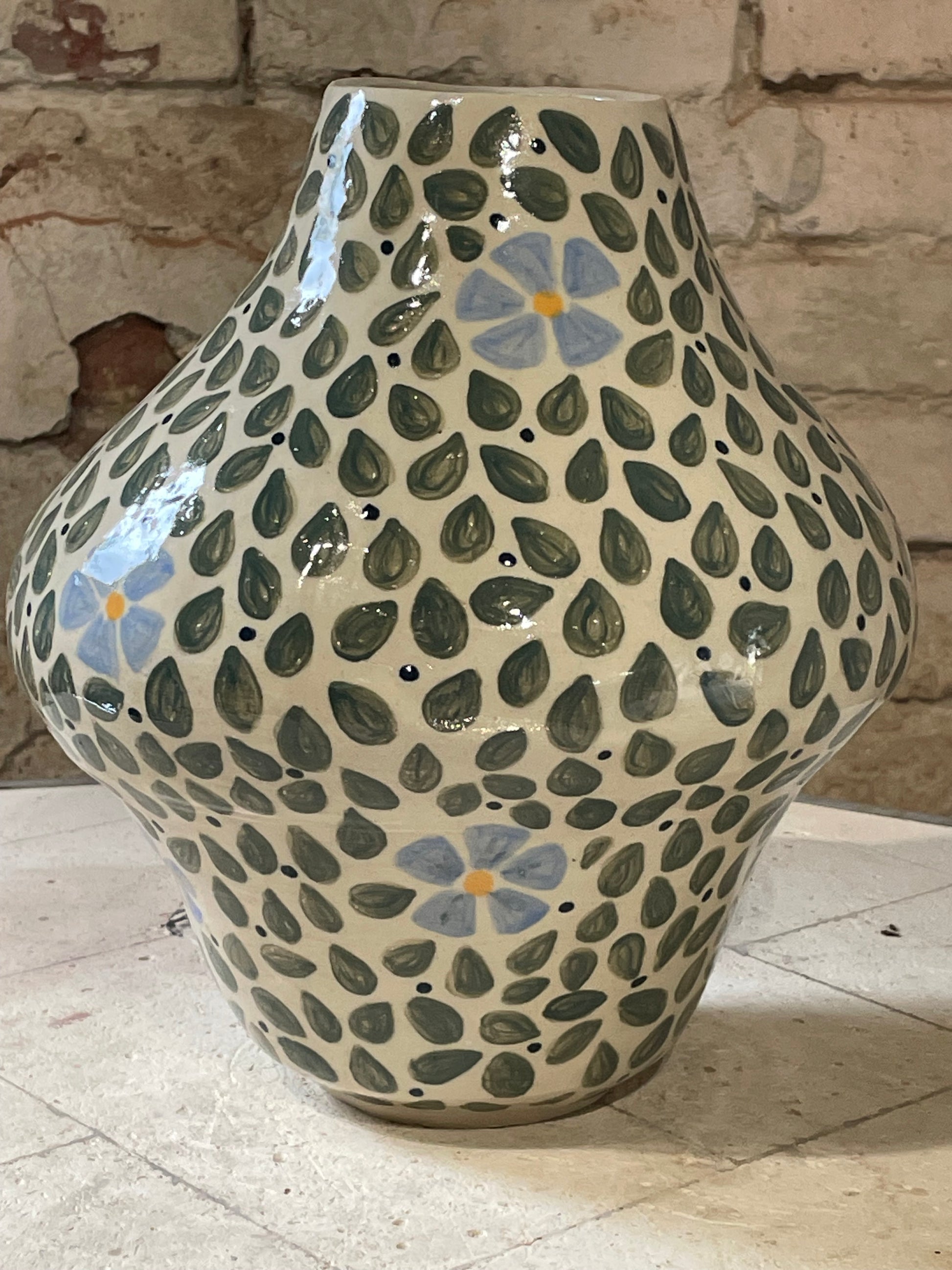 Stoneware pot. Decorated with underglaze leaves and blue flowers